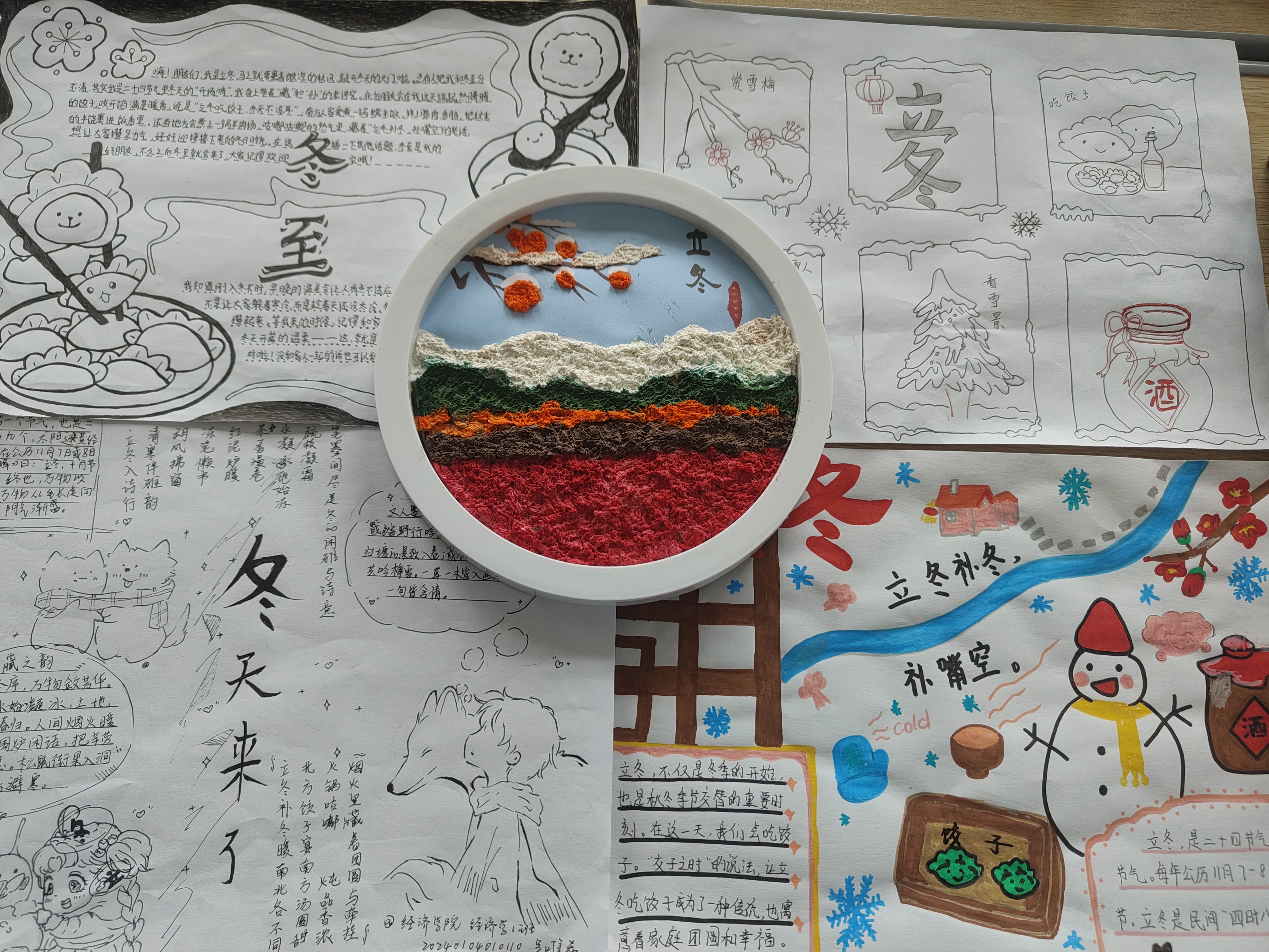 在活动前期,同学们已经围绕立冬主题进行了一系列的创作,一个个兼具创意与内涵的手抄报、手工艺品,琳琅满目,意蕴丰富。活动中,和同学们分享了立冬文化的精髓与相关习俗知识,通过层层递进的讲解,引导同学们沉浸式感悟节气的韵味,深度探寻传统节气的文化脉络,在实践创作与文化熏陶中,深化对劳动价值与优秀传统文化的认知。